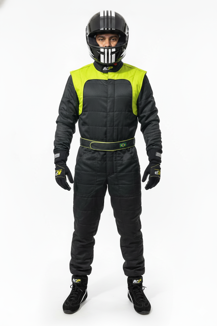 Macacão acolchoado modelo V confeccionado com tecido 56% algodão e 44% poliéster, manta acrílica e a malha que contribui para retenção de calor e liquido expelido pelo corpo (Suor) durante a corrida. Os punhos, junto das mangas e os tornozelos são feitos em poliamida.